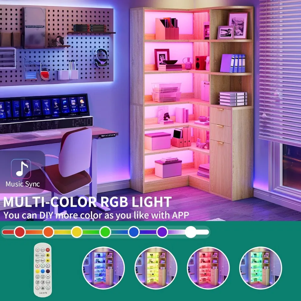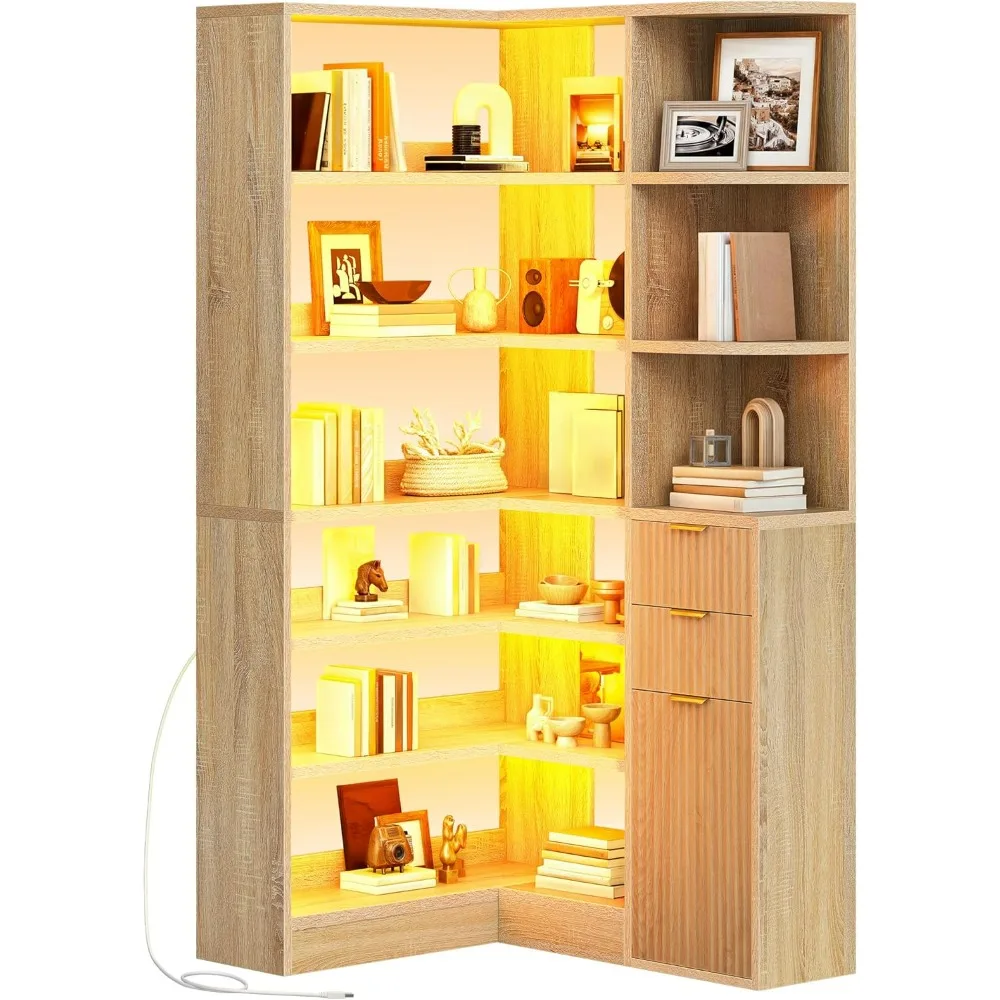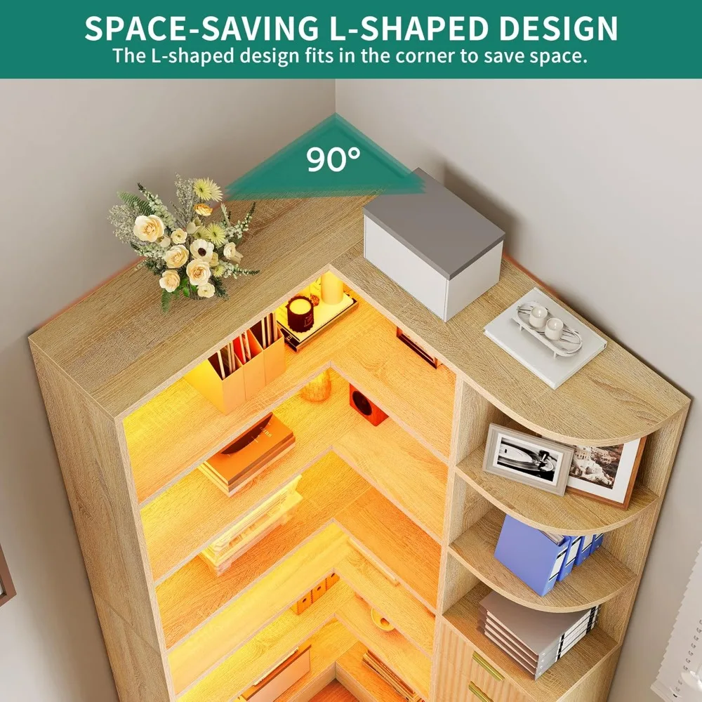 L-Shaped 6-Tier Corner Bookshelf with Storage Drawers and Cabinets, Fluted Design LED Lighted